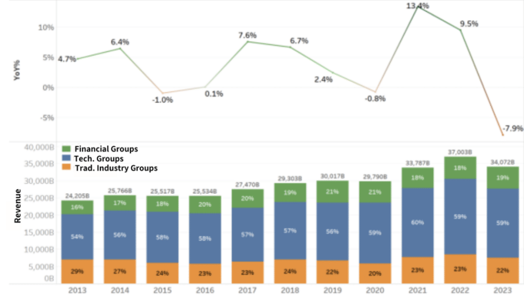 As shown in Figure 2, the total revenue of Taiwan’s top 100 business groups in 2023 reached NT$34 trillion, representing an 8% decline. This drop was primarily attributed to high interest rates and inflation, the global economic slowdown, and the relatively high base period from the previous year. In terms of revenue composition, there was little change. Technology groups continued to account for 60% of the total revenue, while traditional industry and financial groups each maintained a share of approximately 20%.