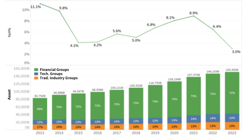 In 2023, the total asset and revenue scale of Taiwan’s top 100 business groups continued to grow compared to 2022. As shown in Figure 1, the total asset scale reached NT$151 trillion (the currency is NT$ throughout the article), marking a 3% increase from 2022. In terms of the core industry of the business groups, financial groups still held the largest share of assets, accounting for as much as 72%. The remaining 30% was evenly split between technology and traditional industry groups.