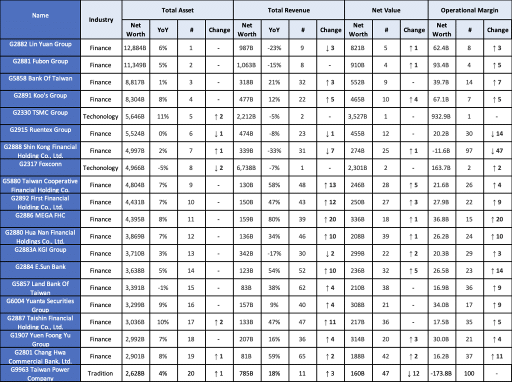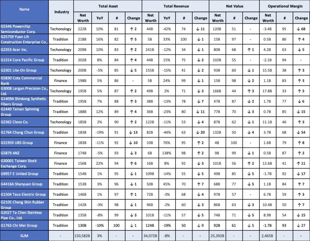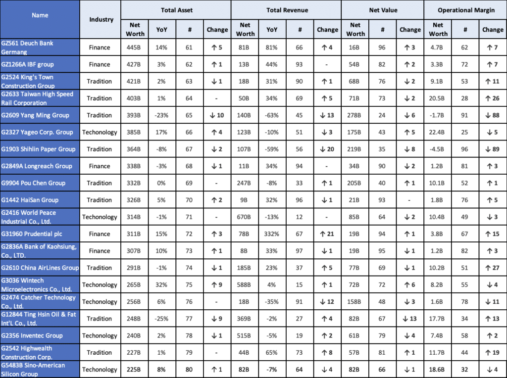Among Taiwan’s top 100 business groups ranked by assets, the following experienced significant ranking changes compared to the previous year: