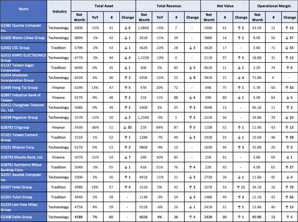 G2382 Quanta Group: Similarly, as a major EMS (Electronics Manufacturing Services) provider, Quanta has been gradually reducing its production capacity in China and establishing factories in other regions to diversify its supply chain in response to customer demands. However, as the supply chain adjustments are ongoing, its asset size has decreased, resulting in a ranking drop of 6 positions to 41st place.