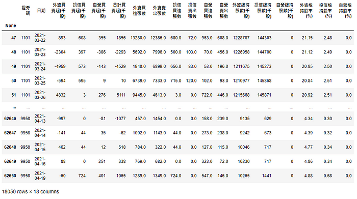 sorted_fi = buyover[buyover['日期']>'2021-03-20'].groupby(by='證券碼').sum().sort_values(by='外資買賣超(千股)',ascending = False)