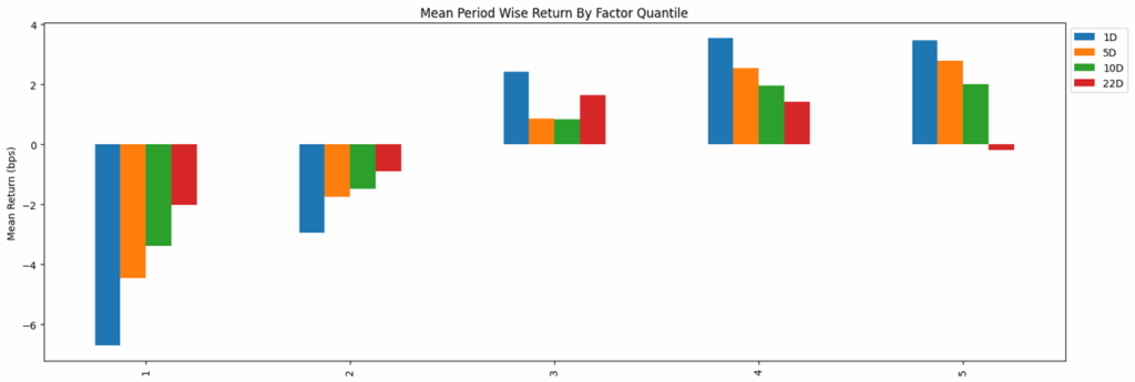 The top quantile portfolio generates higher excess returns in the short run, with a demeaned 1-day average of 3.47 bps. However, its advantage fades as the holding period extends, turning negative at 22 days. Conversely, the bottom quantile consistently underperforms across all horizons, with losses widening over time (reaching -2.01 bps at 22 days). The spread between top and bottom quantiles is most pronounced at 1 day (10.18 bps) and narrows significantly by 22 days (1.77 bps).