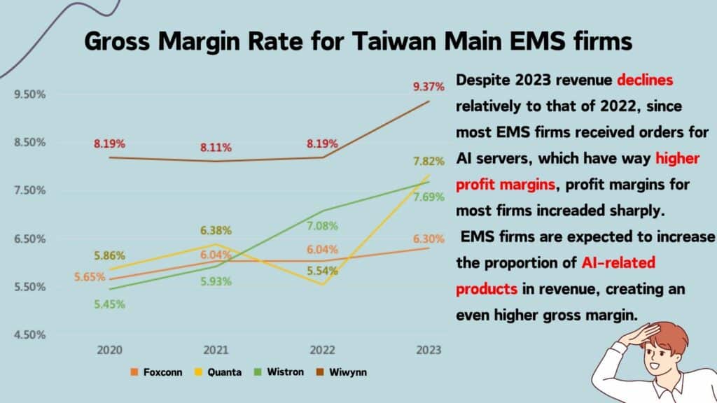 Based on the above, despite the decline in revenue, benefiting from the change in structure of revenue,EMS firms with AI servers accounting for a high portion of revenue attained a higher gross margin rate in 2023.