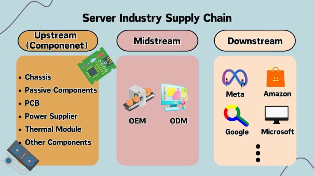 Taiwan has a sound supply chain for the server industry. In the upstream, Taiwan has many renowned electronic components suppliers, such as PSU (Power Supply Unit) supplier — Delta Electronics (2308.TW) and LITEON (2301.TW), Computer Chassis Manufacturer — InWin (6117.TW) and Chenbro (8210.TW), as well as PCB supplier — GCE (2368.TW) and Tripod-Tech (3044.TW). Moreover, with low defect loss, advanced R&D, and outstanding cost management, Taiwan EMS firms are popular for assembling AI servers worldwide. Based on data from Digitimes, over 90% of the world’s AI servers are assembled by Taiwan EMS firms.
