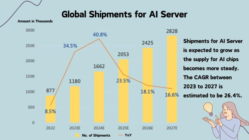 In summary, the rapid commercialization of generative AI has created a surge in demand for AI training. As a result, AI server shipments and sales are expected to grow by over 20% over the next five years.