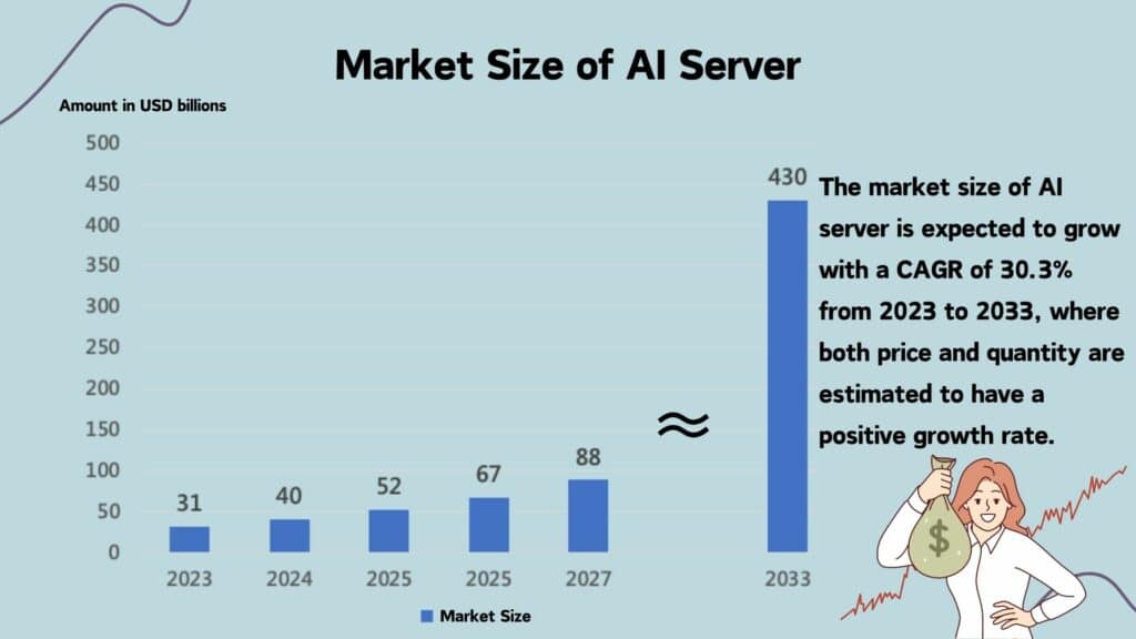 From the perspective of sales, based on Market.us data, AI server is expected to reach USD 430 billion, a CAGR of 30.3%, from 2023 to 2033.