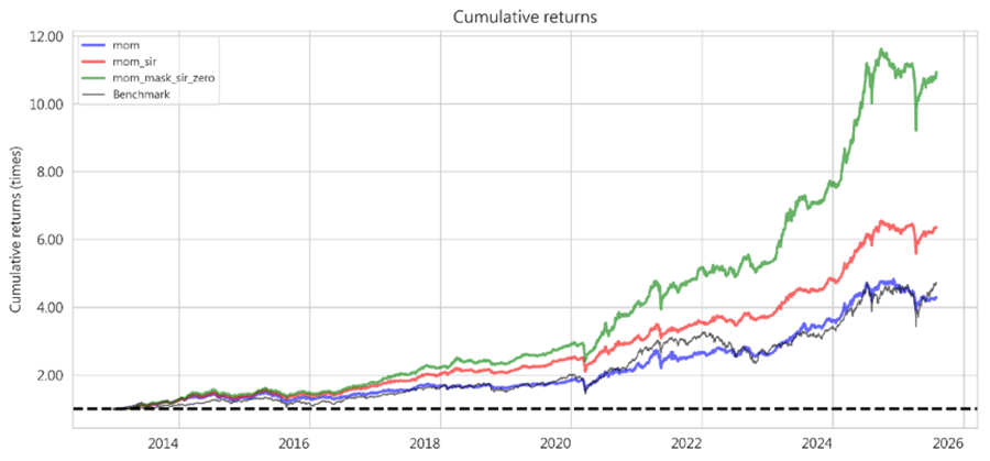 The backtesting results show that both SIR-enhanced strategies outperform the baseline momentum strategy across all key dimensions, including annualized returns, volatility reduction, drawdown control, and overall risk-adjusted performance. Notably, simply filtering out stocks with SIR greater than zero already leads to a substantial improvement in strategy robustness. Meanwhile, the integrated factor approach, which combines momentum and SIR into a unified composite score, further strengthens the consistency of excess returns.
