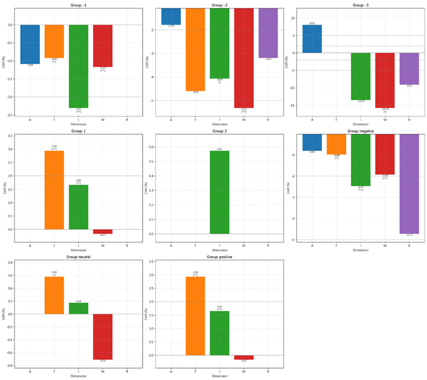 While Part I establishes that news events generate identifiable market reactions, the informational content of news varies widely—from industry developments and financial disclosures to management changes and corporate crises. Event intensity alone is insufficient to explain these differences. Accordingly, this section decomposes news events into five categories (A, I, M, F, R) and examines whether markets respond systematically differently across news types.
