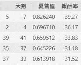result1 = pd.DataFrame(optim, columns=['天數', '夏普值', '報酬率'])