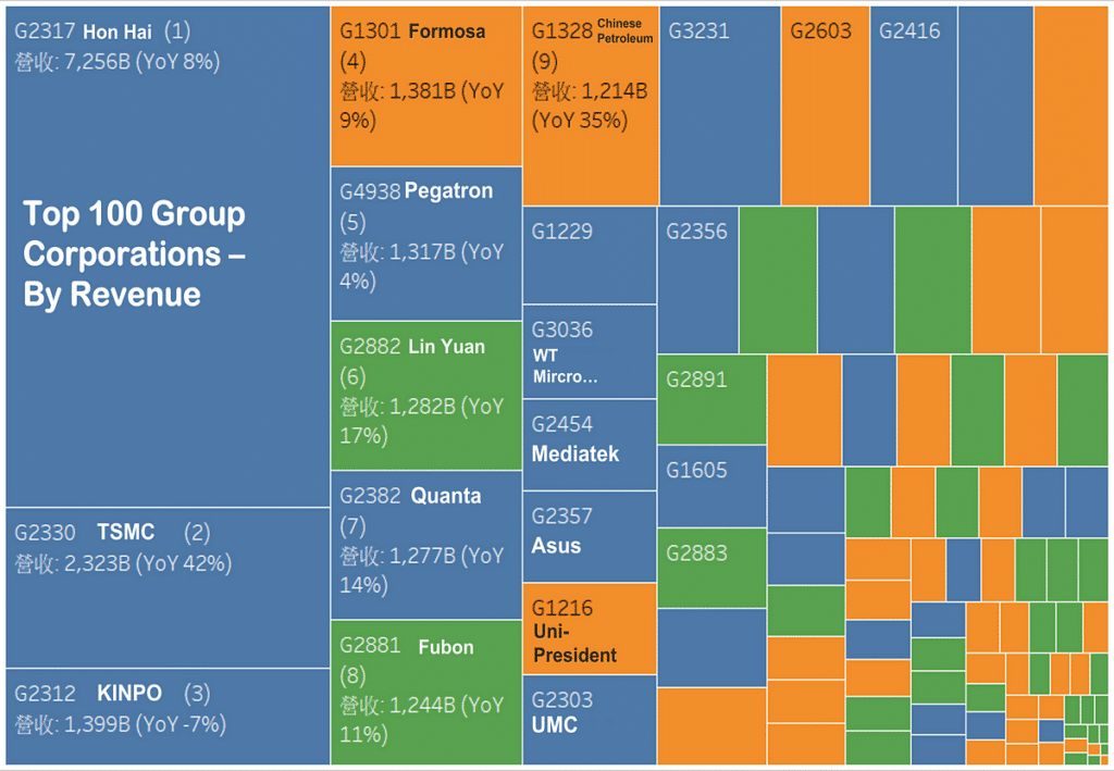 Due to the strong competitiveness of the domestic EMS (Electronic Manufacturing Services) industry, which almost monopolizes the assembly outsourcing for global electronics products, technology group corporation dominate the top 10 in revenue ranking. Among these, six belong to technology ones, including Hon Hai Group, Kinpo Electronics (G2312), and Pegatron Group (G4938). Traditional industries ones occupy two positions in the top 10, with Formosa Plastics Group (G1301) and CPC Corporation (G1328) ranking 4th and 9th, respectively. Financial group corporations hold two seats as well, represented by the Lin Yuan and Fubon Group.