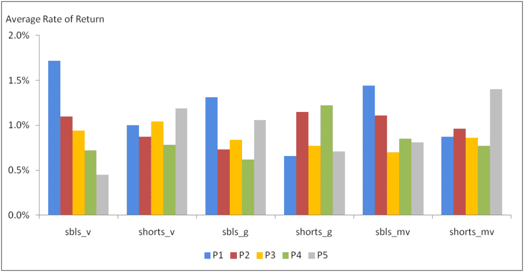 As for portfolio analysis, we sort the variables by size and separate them into 5 equal-weighted portfolios, and according to the number of short selling from low to high, namely as P1, P2, P3, P4, and P5. Next, we hold it for one month and calculated the average return rate, then changed the stocks among the portfolios to see if it is monotonicity and has predictability between short selling variables and expected return. Figure 1 shows sbls_v has the best predictability, which is consistent with the result of cross-sectional regression analysis.