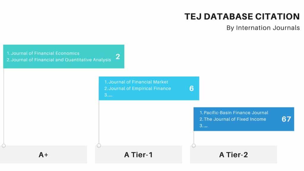 TEJ database is commonly cited in international journals, serving as the first choice for researchers in Finance and Economy. From 2012 to 2022, of all the international journals that received an A + to A Tier-2 grading, a total of 75 thesis/dissertation cited TEJ data, with 2 A+ articles, 6 ATier-1 articles, and 67 A Tier-2 articles.