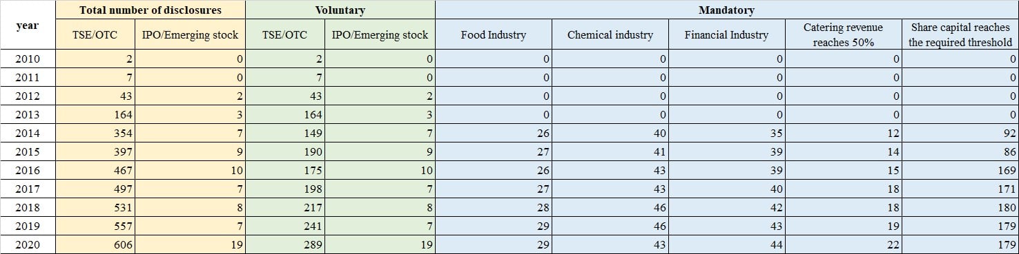 From 2010 to 2013, all sustainability reports were voluntarily disclosed by companies, with limited initial growth until 2013, when there was a significant increase. In 2014, the number of disclosures made by TSE/OTC companies increased from 164 in 2013 to 354 due to mandatory disclosure requirements, of which 205 were compulsory disclosures.