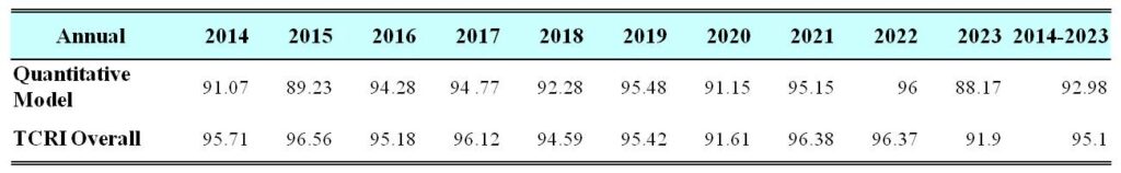 Overall ROC of the TCRI™ in the past 10 years was 88%-97% and an average of 93%, which surpasses the standard of 70% in the Corporate Credit Rating Model Technical Manual.