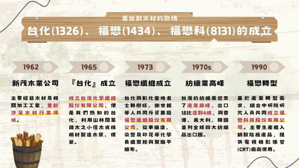1965年3月,成立台灣化學纖維股份有限公司,便是我們熟知的台化,在彰化建立第一座生產基地,利用山林闊葉雜木之小徑木或枝梢材製造木漿、嫘縈。