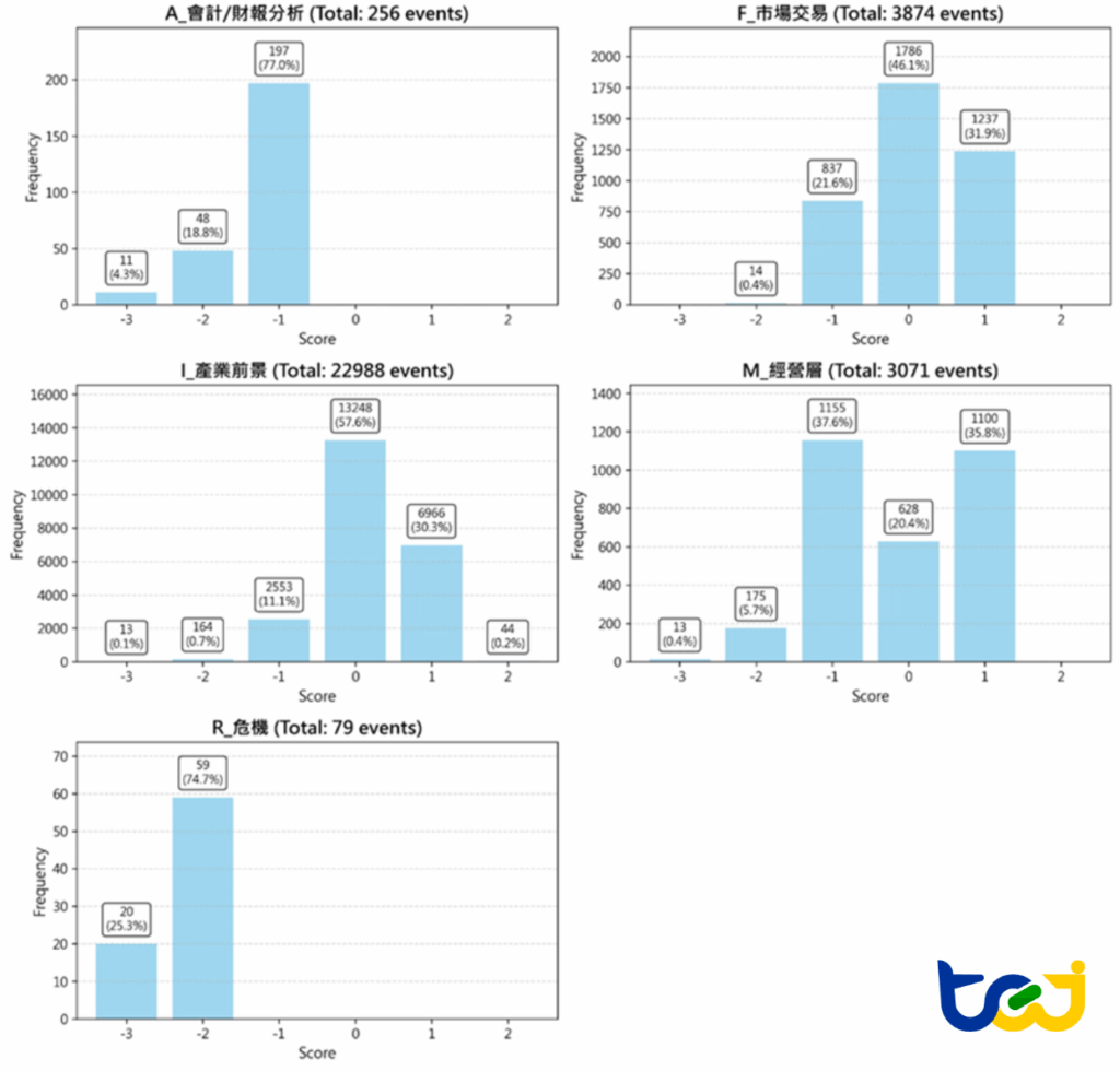 這樣的分布特性也暗示,事件數量多寡,並不等同於市場影響力大小,必須結合股價反應進一步檢驗其資訊含量。