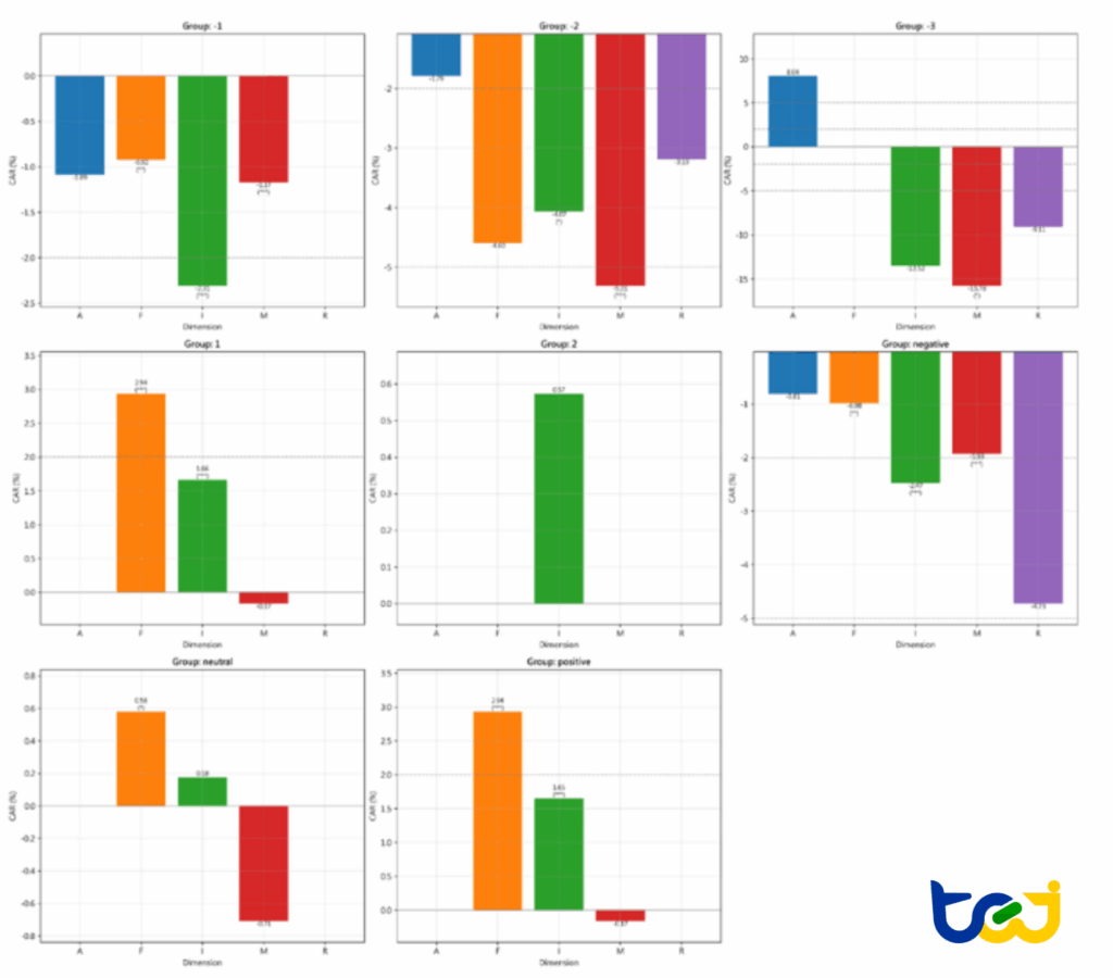 因此,本篇進一步將新聞事件依其性質拆解為五大類(A、I、M、F、R),從事件類別的角度出發,檢視市場是否會對不同類型的新聞展現出系統性差異的反應模式,並辨識哪些新聞類型更可能成為影響股價的重要資訊來源。