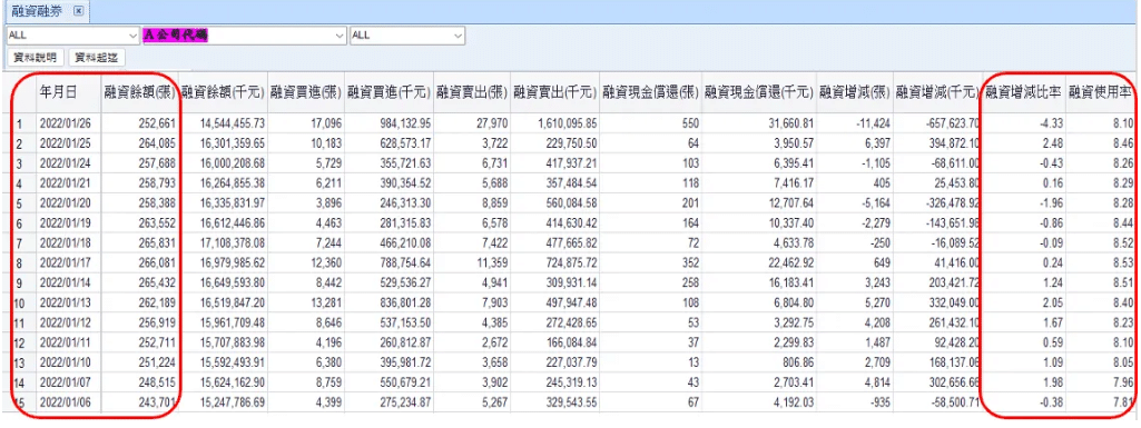 1️⃣ 資券餘額,資券增減變化、融資券使用率