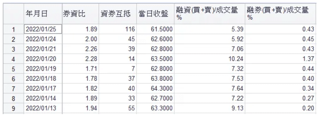 券資比 = [ 融券餘額(張)/融資餘額(張) ]