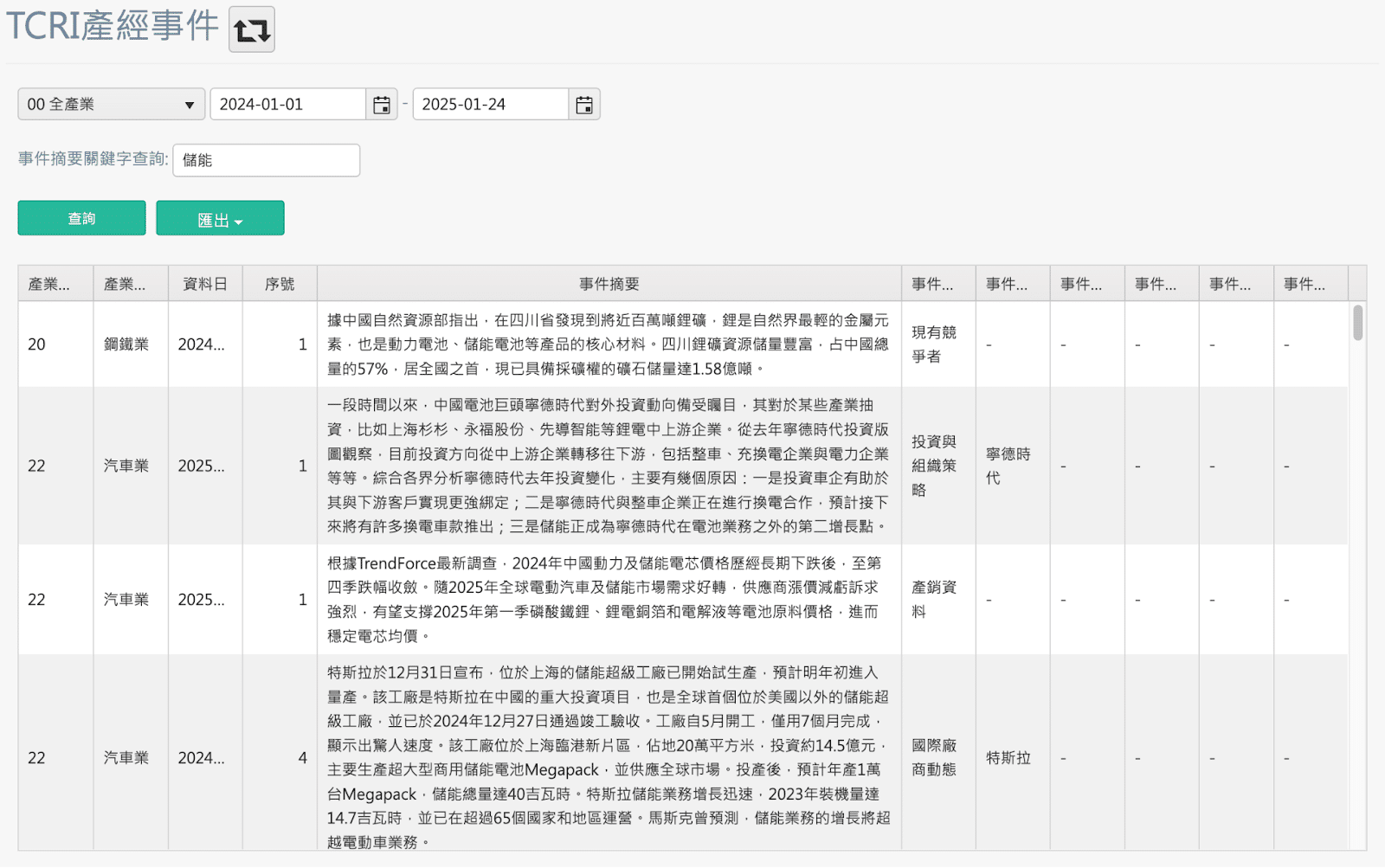 TEJ 產經事件資料庫,收錄包含各大產業新聞事件及其轉載之研調機構產銷資料、政府機構公開資訊…等相關產業資訊。針對市場上產業及總體經濟相關之事件彙總整理,可用於觀察近期產業發展近況。不僅有效蒐集並分類了各類影響產業的重大事件,還將這些事件與關鍵字詞進行精確標註,讓使用者能輕鬆掌握與自身業務相關的事件動態,進而迅速作出營運判斷。