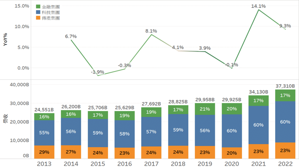 再就營收規模分析,如圖二,2022 台灣百大集團整體營收達 37 兆元,年增 9%,主要受惠疫後景氣回溫及地緣政治的轉單效應,營收自 2021 年後已連續兩年成長。就組成結構而言,亦無明顯變化,仍是以科技集團的佔比最大,約達 60%,其次為傳產集團的 23%及金融集團的 17%。