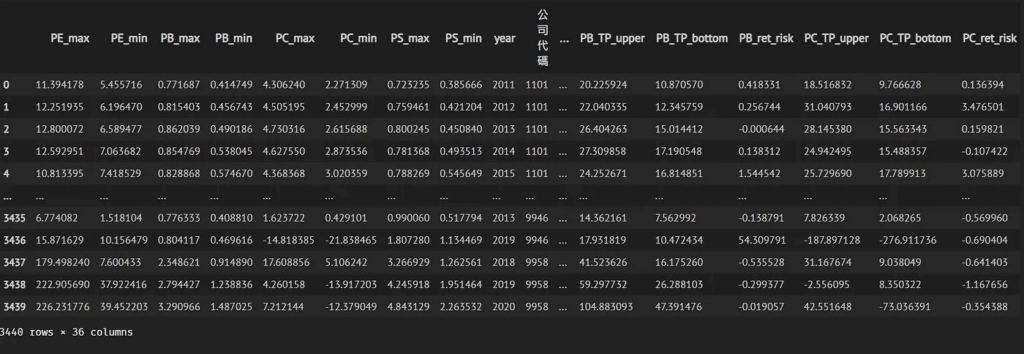 下方程式碼功能為計算個年度本益比(PE), 股價淨值比(PB), 股價現金流量(PC)和股價營收比(PS)之最高和最低值。