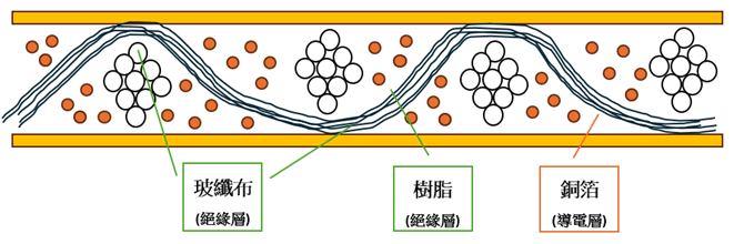 在製程上,玻纖布經樹脂含浸後,透過烘烤去除溶劑,形成所謂的黏合片(Prepreg,簡稱 PP)。黏合片再與銅箔經由壓合製程結合,最終製成硬式或軟性銅箔基板(Copper Clad Laminate, CCL)(詳見圖二),並成為後續硬板與軟板製造不可或缺的核心材料。