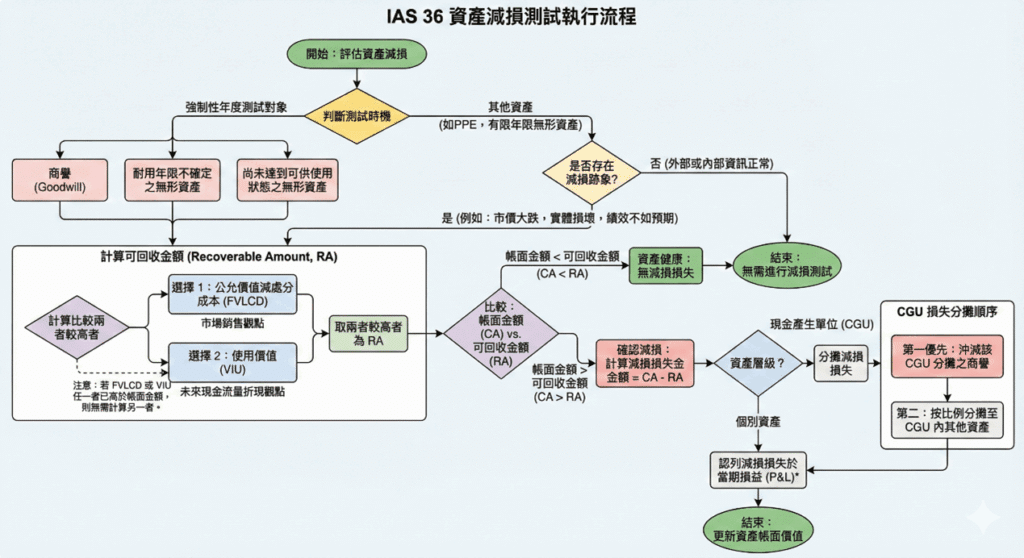下圖為 IAS 36 資產減損測試的標準決策流程,協助您從判斷是否存在減損跡象,到計算可回收金額與認列減損的評估作業。