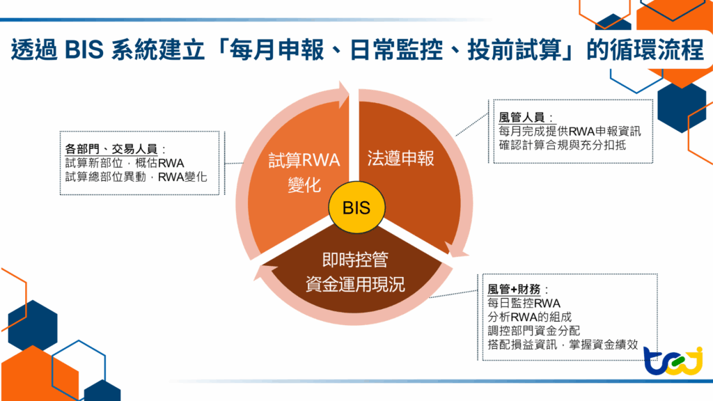對財管單位而言,BIS 系統不僅是申報工具,更是掌握可用資本的重要關鍵。系統產出的風險約當金額(RWA)與自有資本相關報表,可用於檢視資金使用狀況、分析 RWA 組成與變化,並搭配損益資訊評估資金運用效率,作為資金配置與內部管理決策的參考基礎。