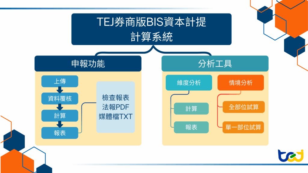 TEJ 券商版 BIS 資本計提計算系統,係依據證券商資本計提進階計算法所設計,整合資料處理、風險計算與申報產出,協助券商以系統化方式完成資本計提與管理工作。