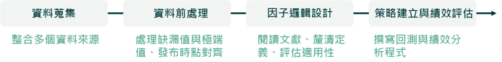其次,資料前處理需處理缺漏值、極端值與發布時點對齊,這些作業耗時且技術門檻高。 接著,設計與撰寫因子邏輯需研讀大量文獻,釐清定義與計算邏輯,並考量是否適用於本地市場,進一步拉高研究門檻。