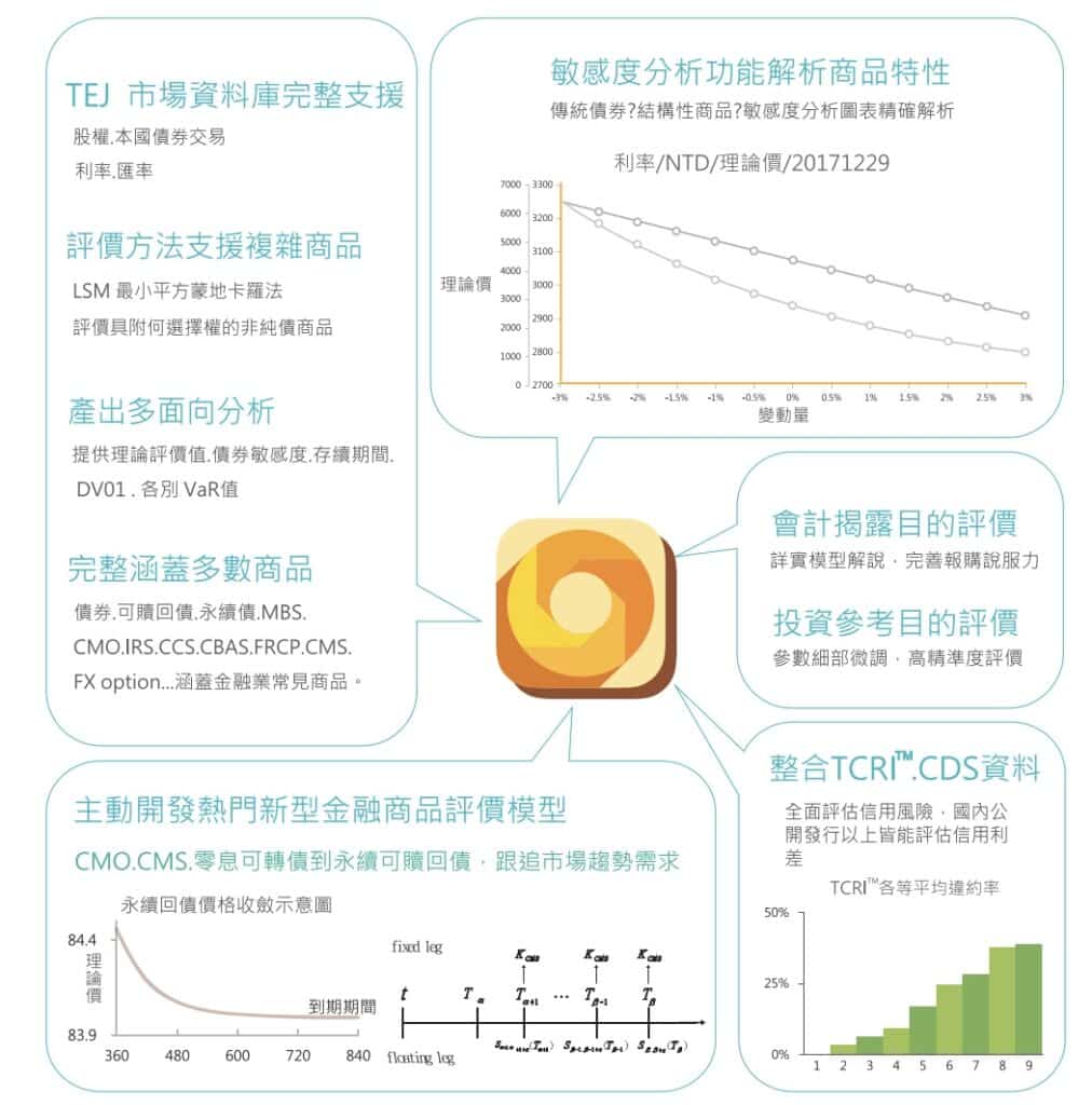 目前評價的資產範圍以債券及利率商品(CBAS、FRCP)為主。系統除了計算理論價、利率價差及單位個別風險值外,同時提供資產評價相關的重要數據資料。